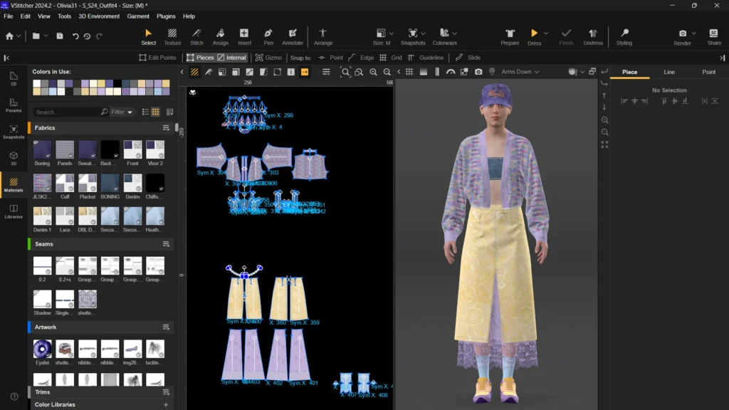 The digital library framework I defined in VStitcher provided validated, reusable pattern blocks. Vstictehr and Lotta allowed design freedom within those validated constraints. The result: a single physical sample per colorway, with 3D models carrying the rest.